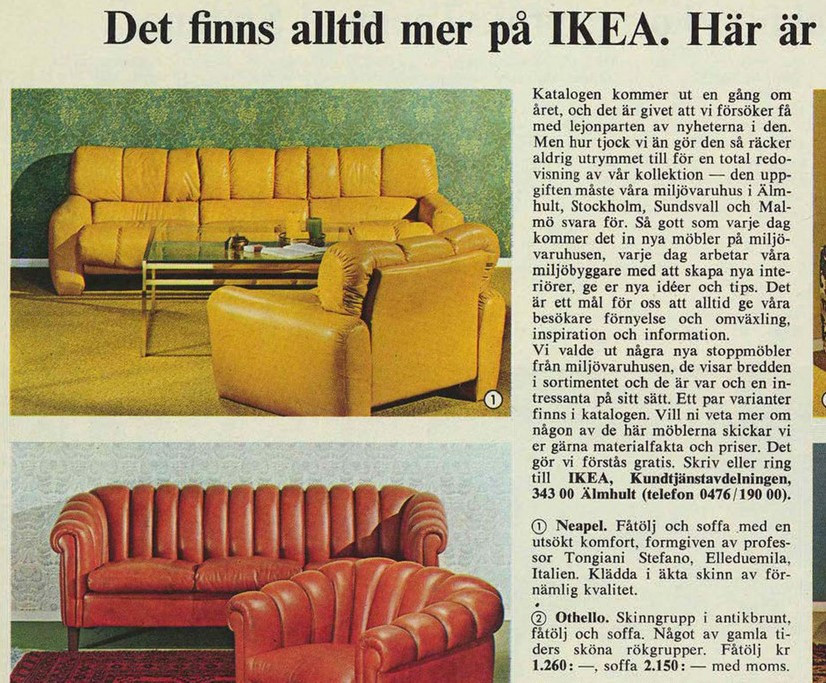 5. Neapel. Skinnsoffa från 1972 som blivit superpoppis igen. Kom i gult, rött och cognacsfärgat. Utrop på 1 000 kronor, klubbades för 9 013 kronor hos Gomér & Andersson i november. Hos Pamono ligger en brun Neapel 3-sits ute för 79 000 kronor. I katalogen stod det att den var formgiven av professor Tongiani Stefano, en 3-sits kostade 2 755 kronor.