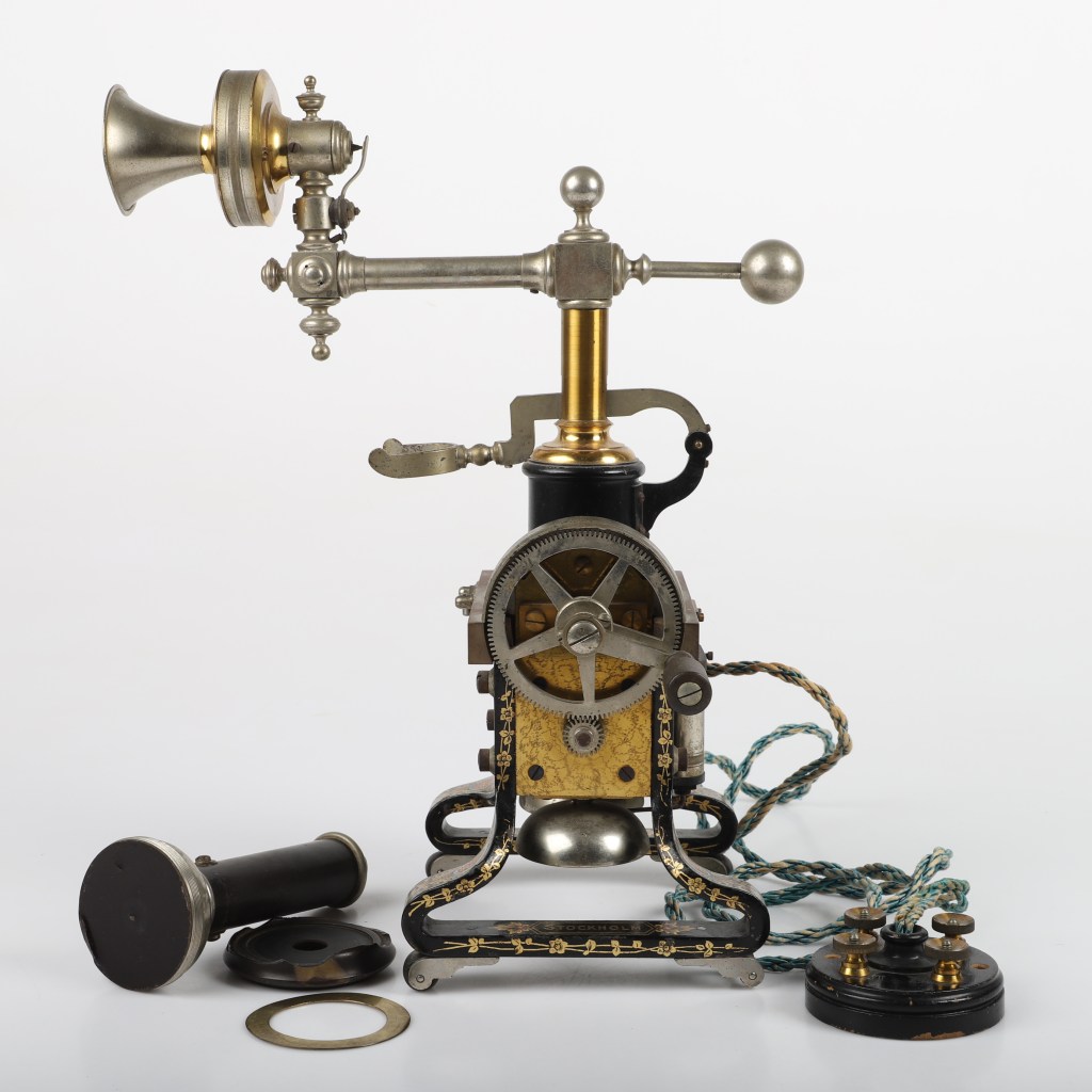 21. Telefondelar. Troligen sändare och mottagare, 1800-tal. Utrop 3 000 kronor, klubbade för 63 001 kronor hos Gomér & Andersson i juni.