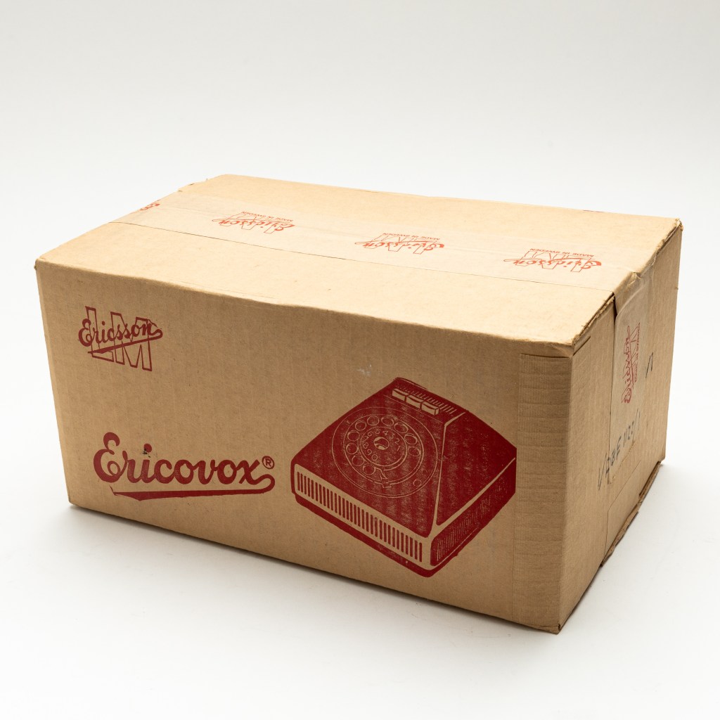 23. Ericovox. Högtalartelefon i obruten förpackning. Lanserades 1959 av L.M Ericsson. Formgiven av arkitekterna Magnus Ahlgren, Torbjörn Olsson, Sven Silow och Dean L Smith. Utrop 600 kronor, såld för 1 963 kronor hos auktionshuset Kolonn.