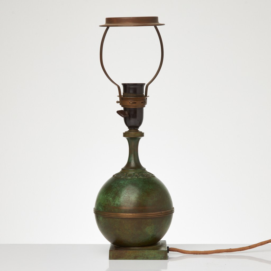 6. Bordslampa 1930-tal. Grönpatinerad brons, Art Deco stil. Från GAB modell 58. Stämpelmärkt. Utrop 5 000 kronor, klubbad för 4 708 kronor hos Stockholms auktionsverk Sickla i september.
