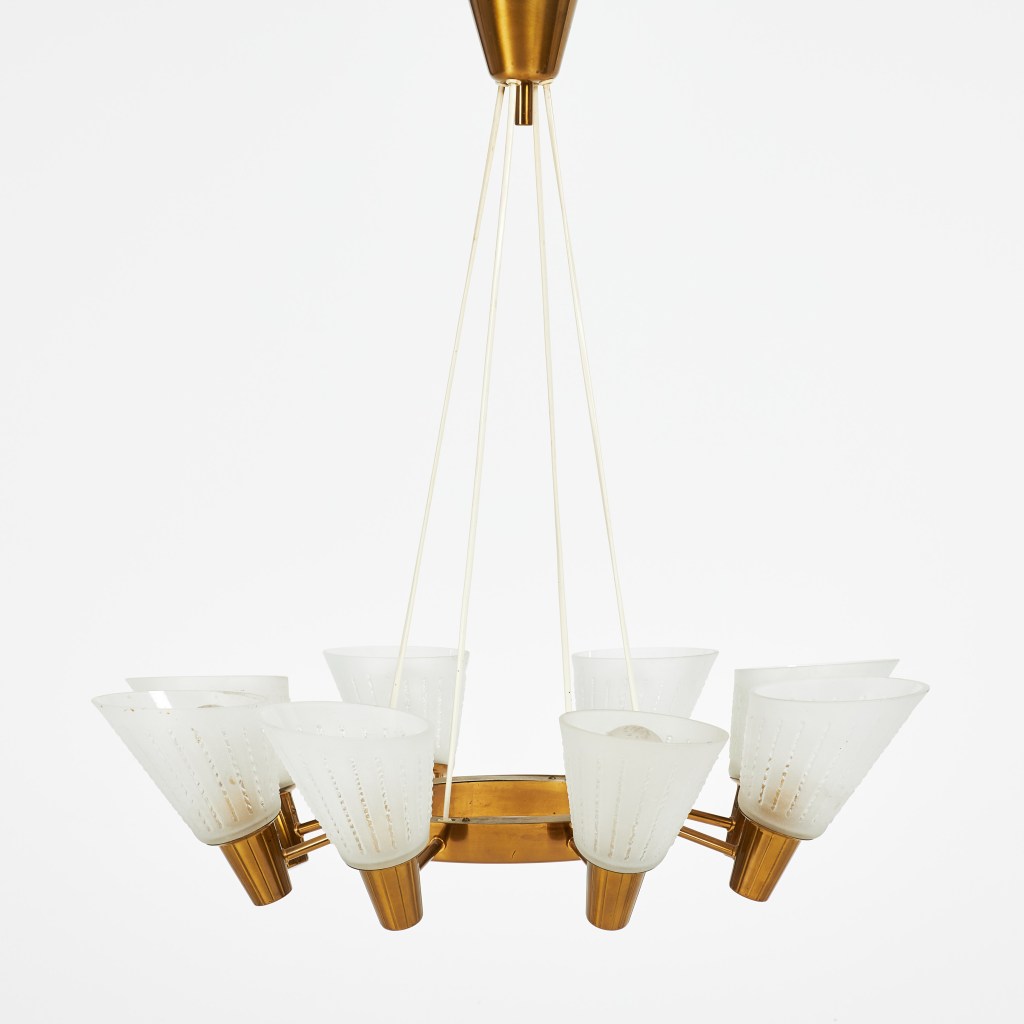 10. Taklampa 1900-talets mitt. Stil Swedish Modern. Åtta ljusarmar. Etsade glaskupor. Utrop 8 000 kronor hos Stockholms auktionsverk Sickla i april, klubbad för 34 166 kronor.
