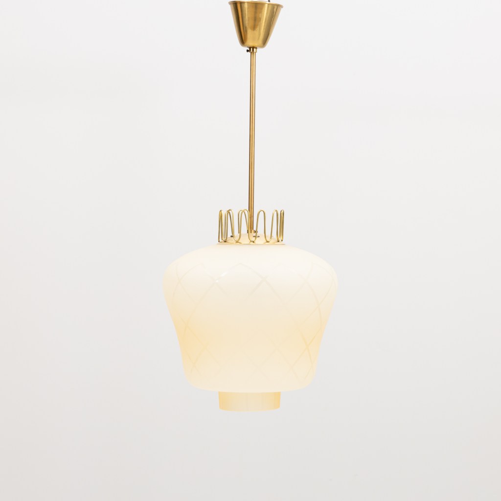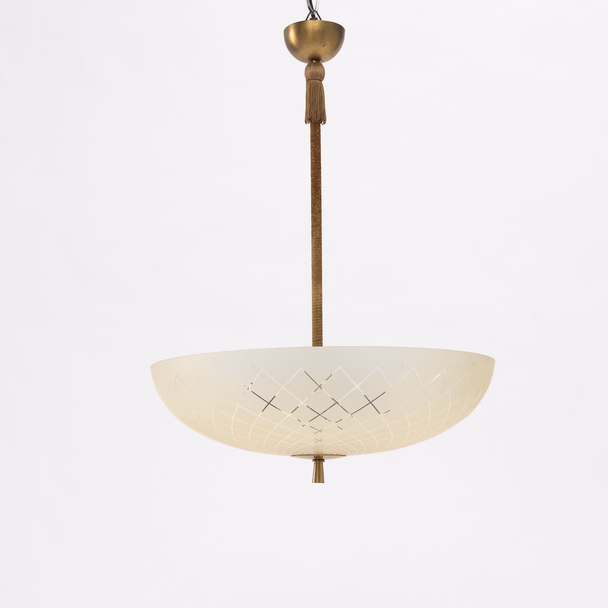 13. Taklampa 1940-tal. Frostad glaskupa och mässing. Stil Swedish Modern. Utrop 5 000 kronor, klubbad för 4 441 kronor hos auktionshuset Kolonn i oktober.