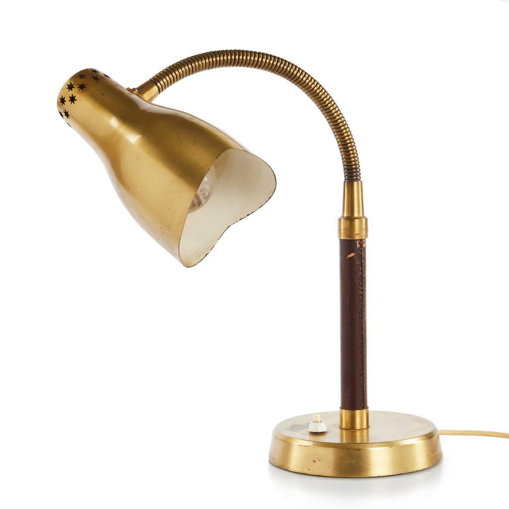 15. Bordslampa 1940-tal. Av Hans Bergström för ateljé Lyktan i Åhus. Modell 717. Mässing och läder. Stil Swedish Modern. Utrop 4 000 kronor, klubbad för 10 000 kronor hos Crafoord auktioner i Stockholm.