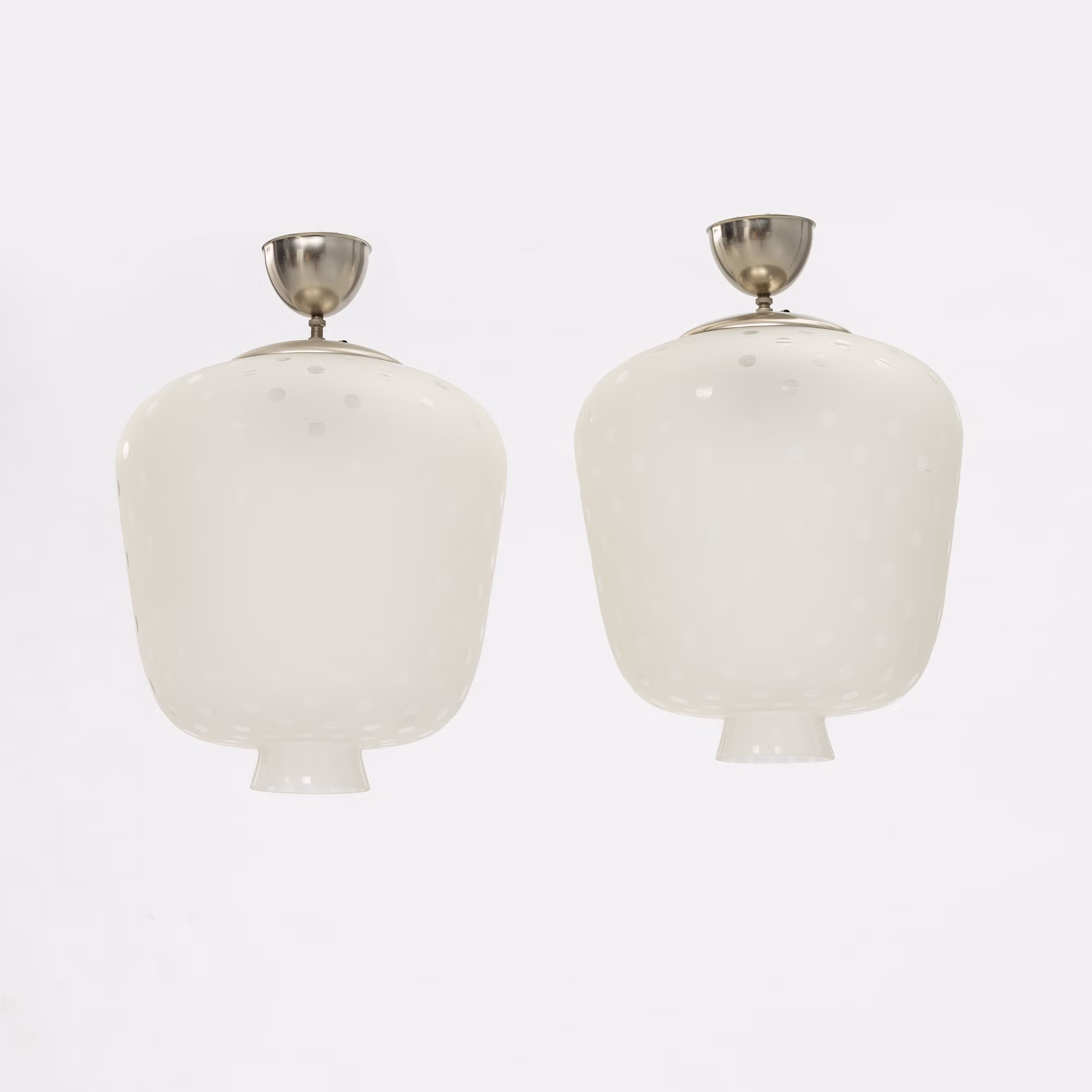 4. Taklampor 1940/1950-tal. Ett par taklampor, etsad dekor av prickar. Från Flygsfors glasbruk i Småland, under 1950-talet var Flygsfors Europas största tillverkare av av belysningsglas och hade runt 200 anställda. Utrop 15 000 kronor hos Bukowskis, sålda för 40 000 kronor.