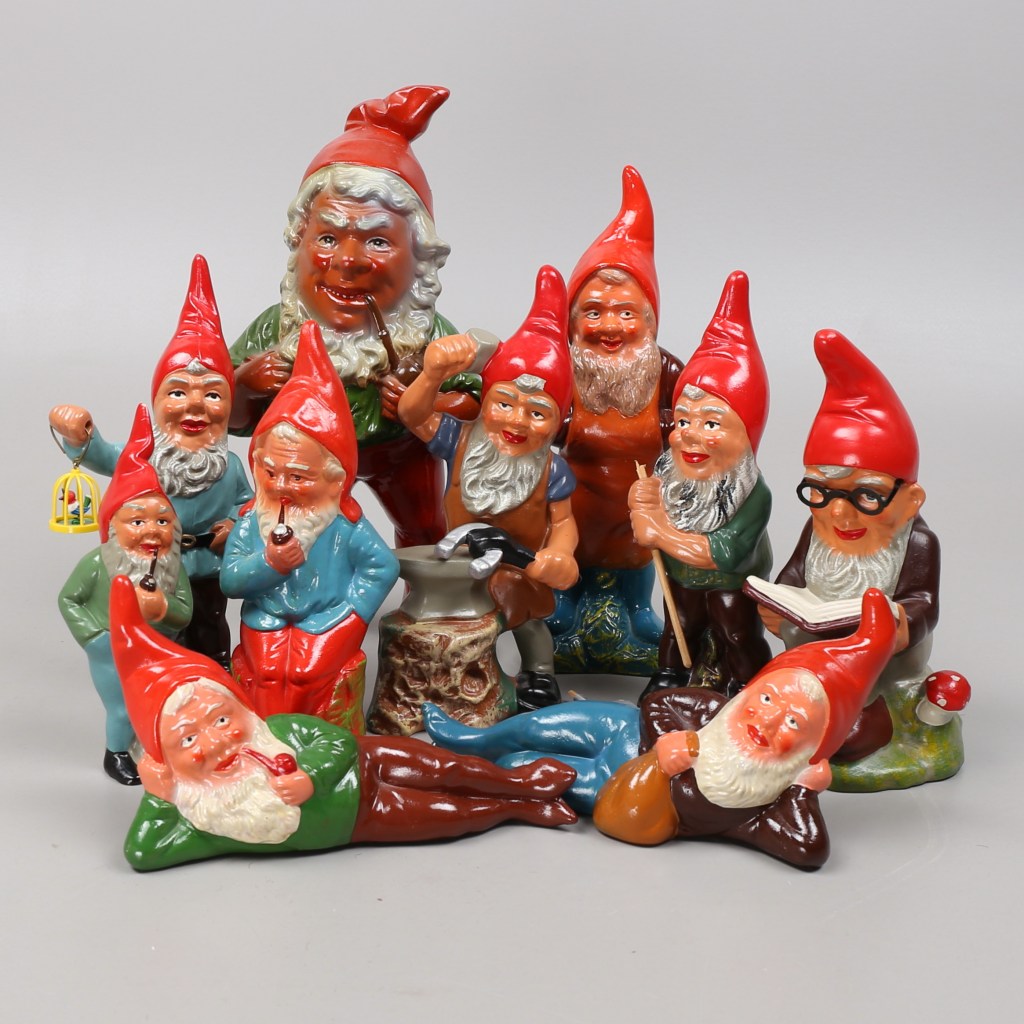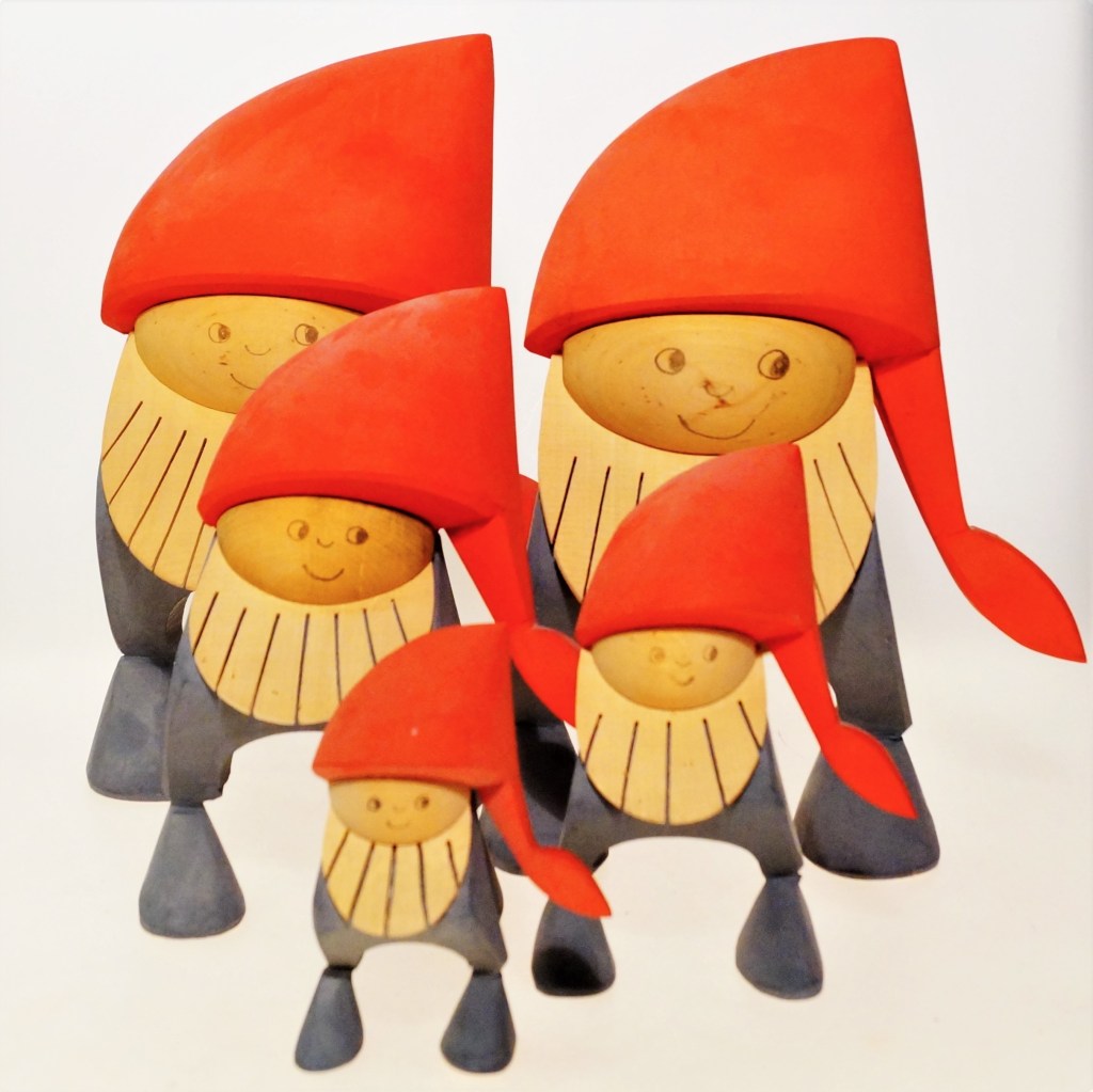 16. Ljungskiletomtar. I trä från 1975. 11,5 till 27 cm höga. Utrop 600 kronor, klubbade för 500 kronor hos Lysekils auktionsbyrå.