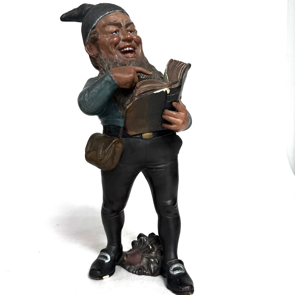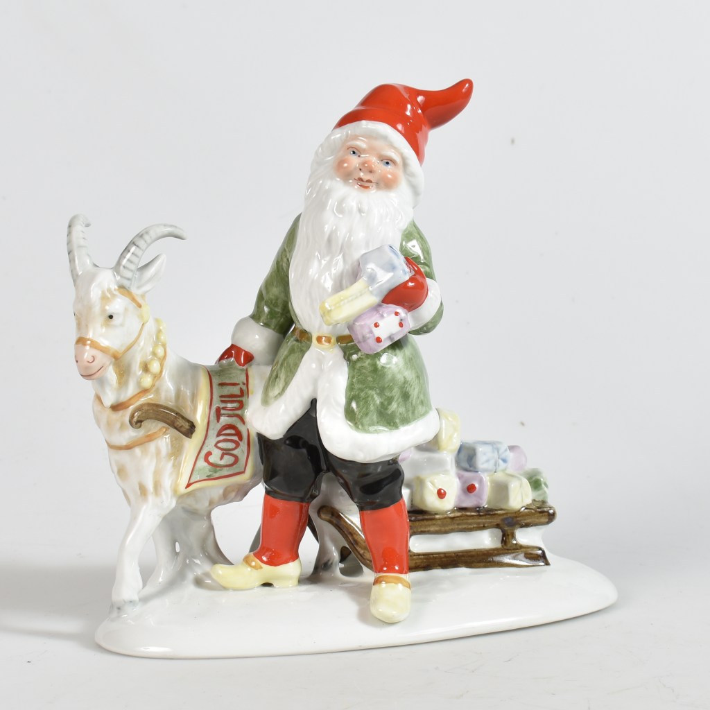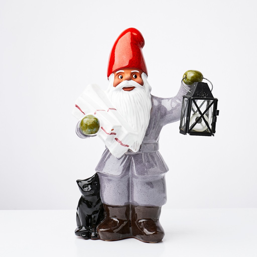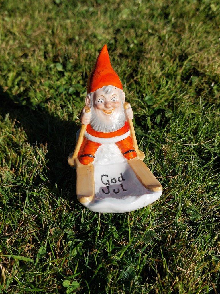 19. Rökande tomte. Troligen tysk, keramik, från omkring 1900. 36,5 cm hög, nagg, och lite skador samt en lagad hand och ett finger saknas. Utrop 2 000 kronor hos Crafoord auktuoner i Malmö, såld för 8 126 kronor.