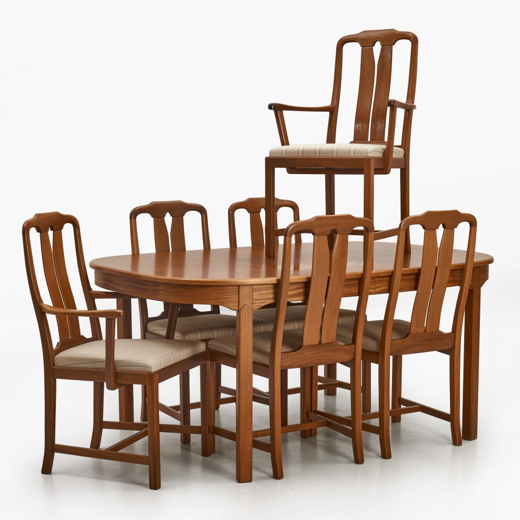 2. Ambassadör. En av Malmstens senare matsalsgrupper. Har stigit ordentligt i pris under de två senaste åren. Här tio delar i mahogny. Utrop 8 000 kronor, klubbat för 40 000 kronor hos Crafoord auktioner i Stockholm.