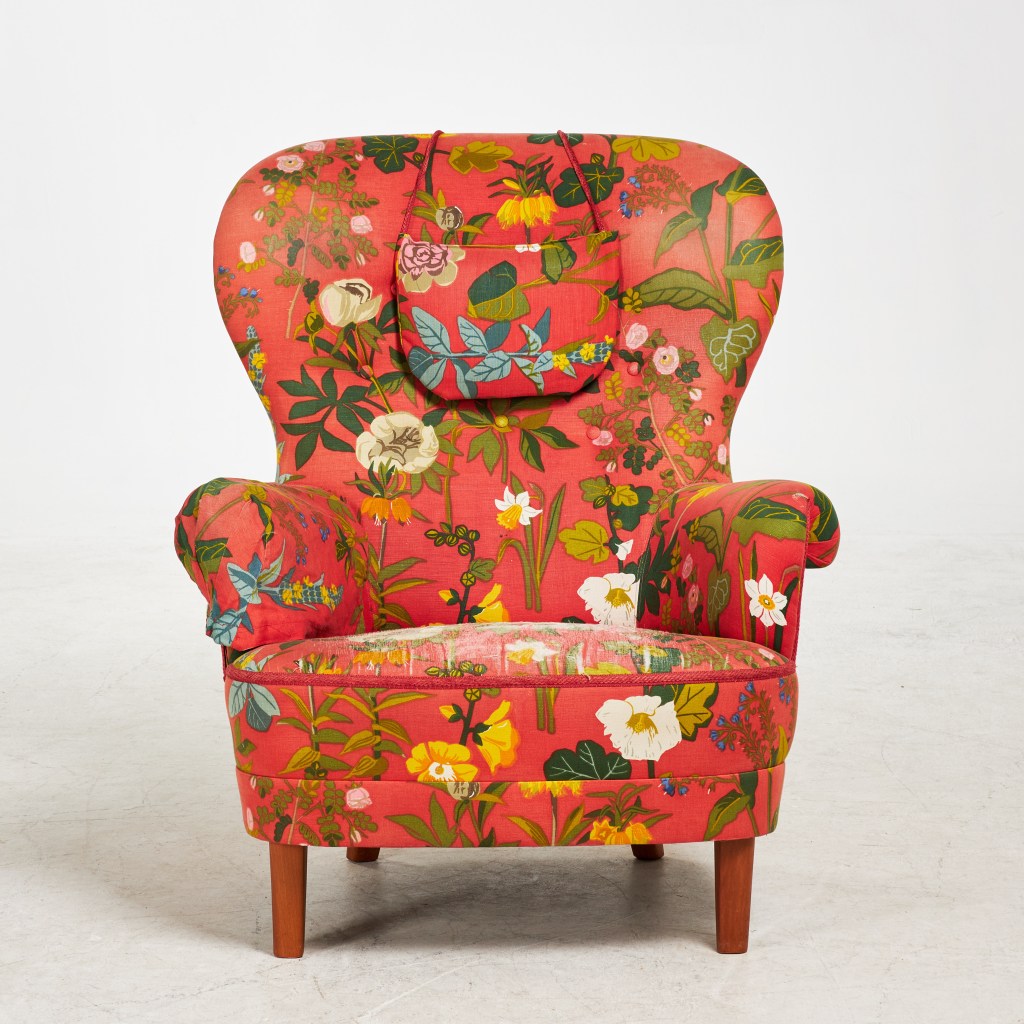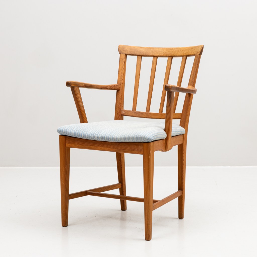 12. Visingsö karmstol. Serien Visingsö kom i början av 1950-talet. Finns både som soffa, bänk, pall och karmstol. I furu. Utrop 1 000 kronor, klubbad för 5 501 kronor hos auktionshuset Kolonn.
