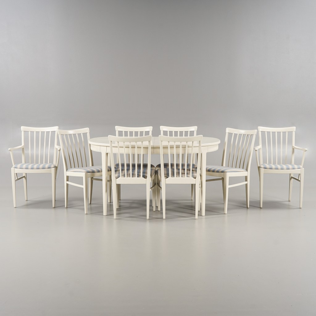 6. Herrgården. En av de vanligaste och mest sålda matsalsmöbler som finns i Sverige. Formgiven 1955. Här i vitt, tillverkat hos Bodafors 1961. Går ofta väldigt billigt, men börjar gå upp nu. Det här möblemanget med tio stolar och ett bord blev faktiskt en prisbomb. Utrop 6 000 kronor, klubbat för 68 000 kronor hos Karlstad Hammarö auktionsverk.