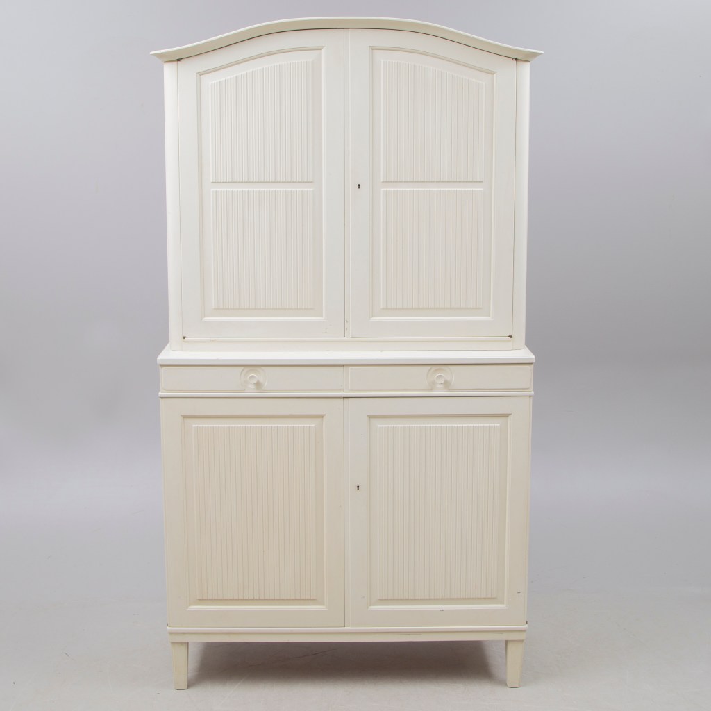 11. Herrgården. Ett tvådelat skåp som ingår i Herrgården. En av de vanligaste och mest sålda matsalsmöbler som finns i Sverige. Formgivet 1955. Här i vitt, tillverkat hos Bodafors 1900-tal. Går ofta billigt, men börjar gå upp nu. Utrop 7 000 kronor, klubbat för 9 000 kronor hos Kalmar auktionsverk.