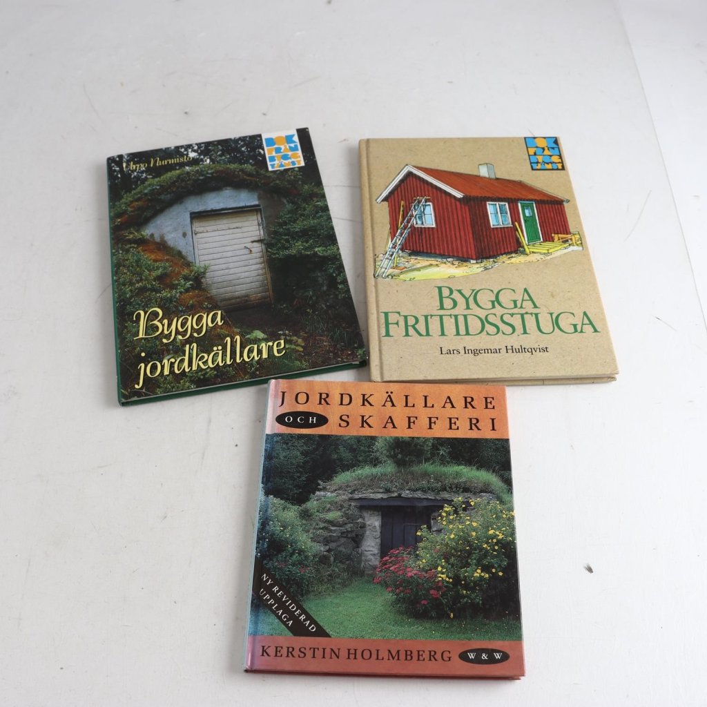 10. Bygga jordkällare + Bygga fritidsstuga + Jordkälllare och skafferi. Böcker om byggnadskonst och hantverk är heta. Här tre stycken från 1990-talet. Utrop en krona, klubbade för 808 kronor hos Myrorna.