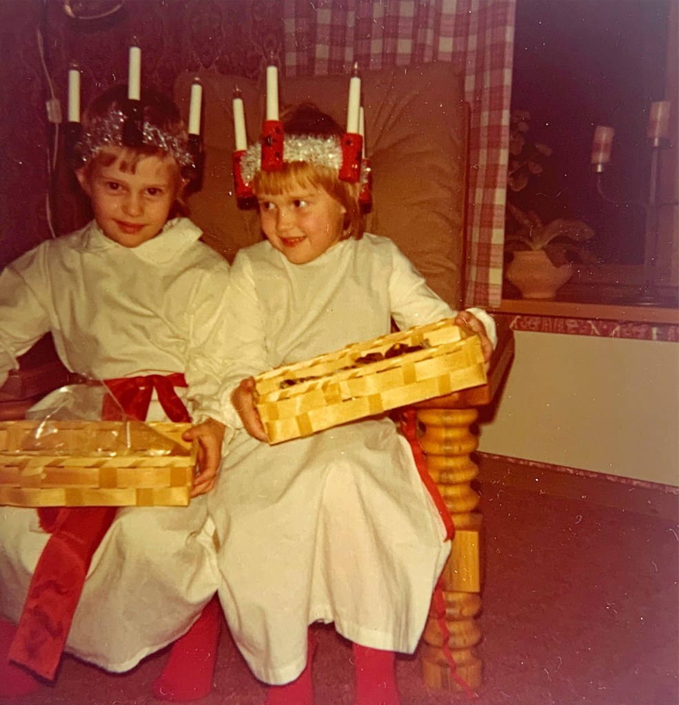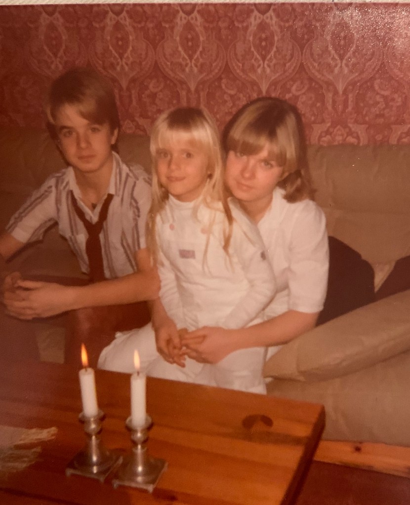 18. Brosan, syrran och jag i allrummet på ovanvåningen. Stor brutalistisk soffgrupp i furu, blånad och kvistig. Till och med den vita färg-tv:n från Telefunken stod på en massiv furumediamöbel, även den vita stereon. Brorsan lyssnade på Sweet och Slade, jag på Bryan Ferry och Pugh Rogerfeldt, syrran älskade Trazan Apansson. Furutaket var målat i svart. Tapeten hade stora rosa medaljonger som syns här, på golvet en matchande rosa heltäckningsmatta. Måste varit ett av de mest spejsade rummen i hela Färjestaden. Missa inte brorsans löst hängande slips, väldigt trendigt.