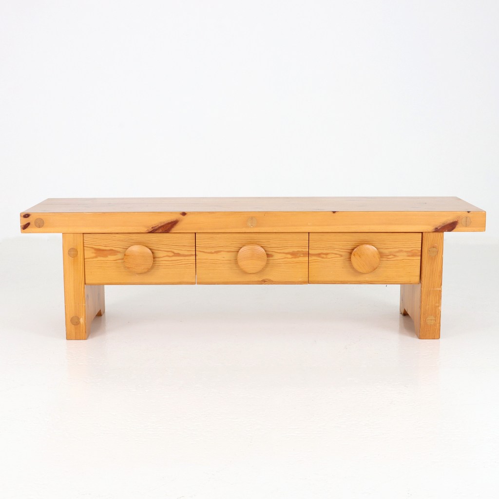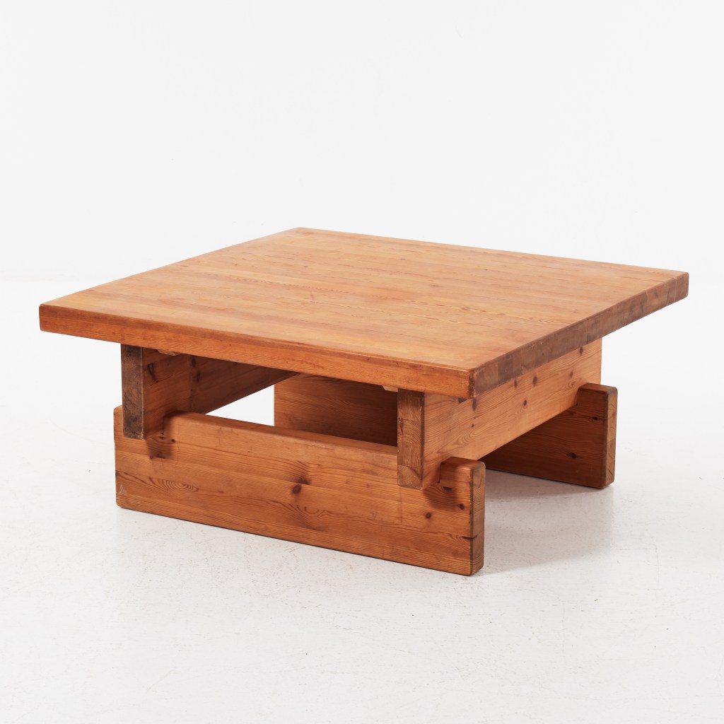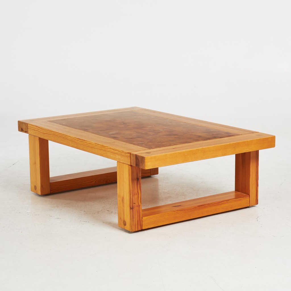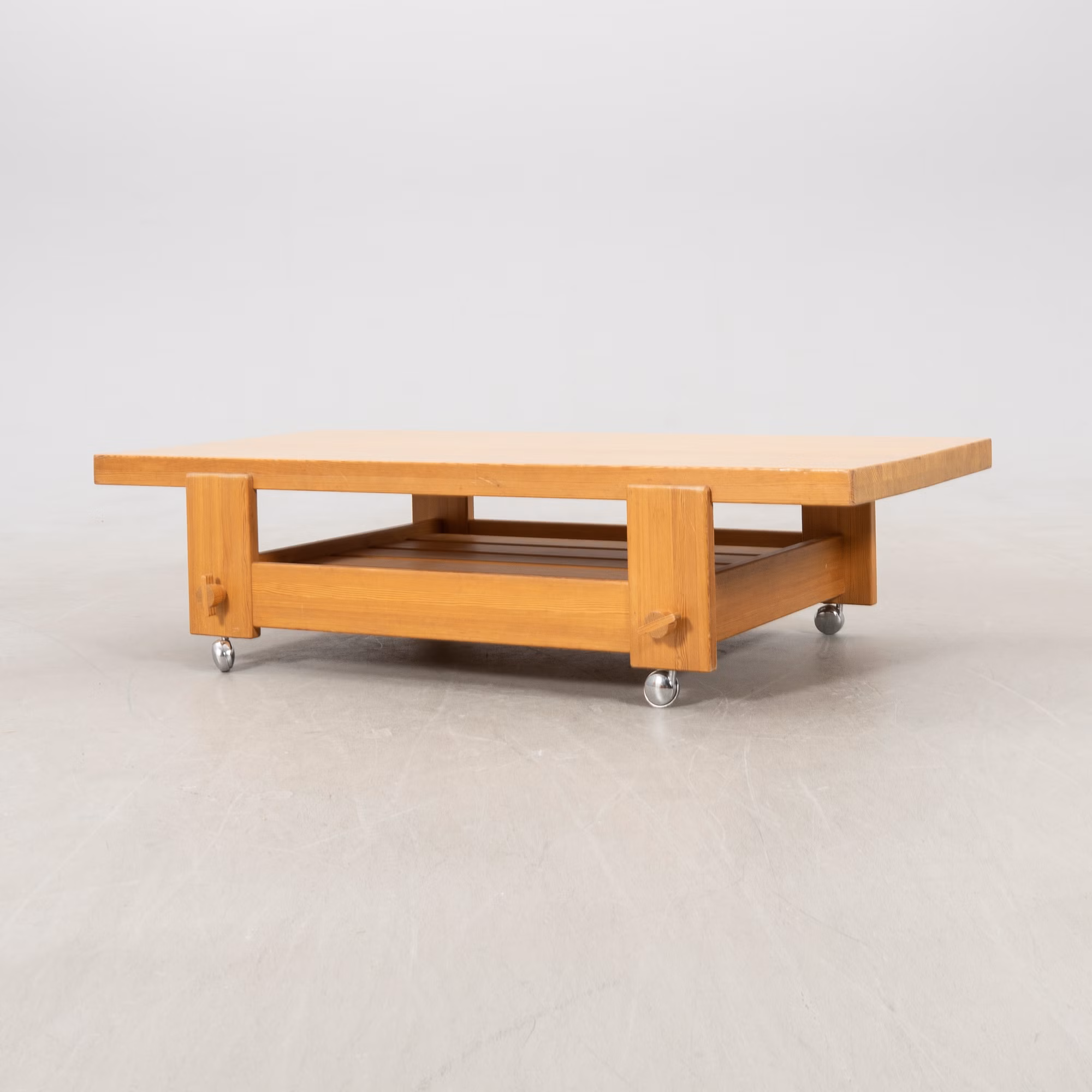 14. Patron. En serie av Christer Lundén för Broby Nya Möbler AB. Visades på Möbelmässan 1974 och fick stort genomslag. “Möbler med vikingamått för export.” Här bordet, fanns även 3-sits och 2-sitssoffa, samt fåtölj och hörnbord. Bordsskivan av kubb. Utrop 1 500 kronor, klubbat för 2 005 kronor hos Stockholms auktionsverk.