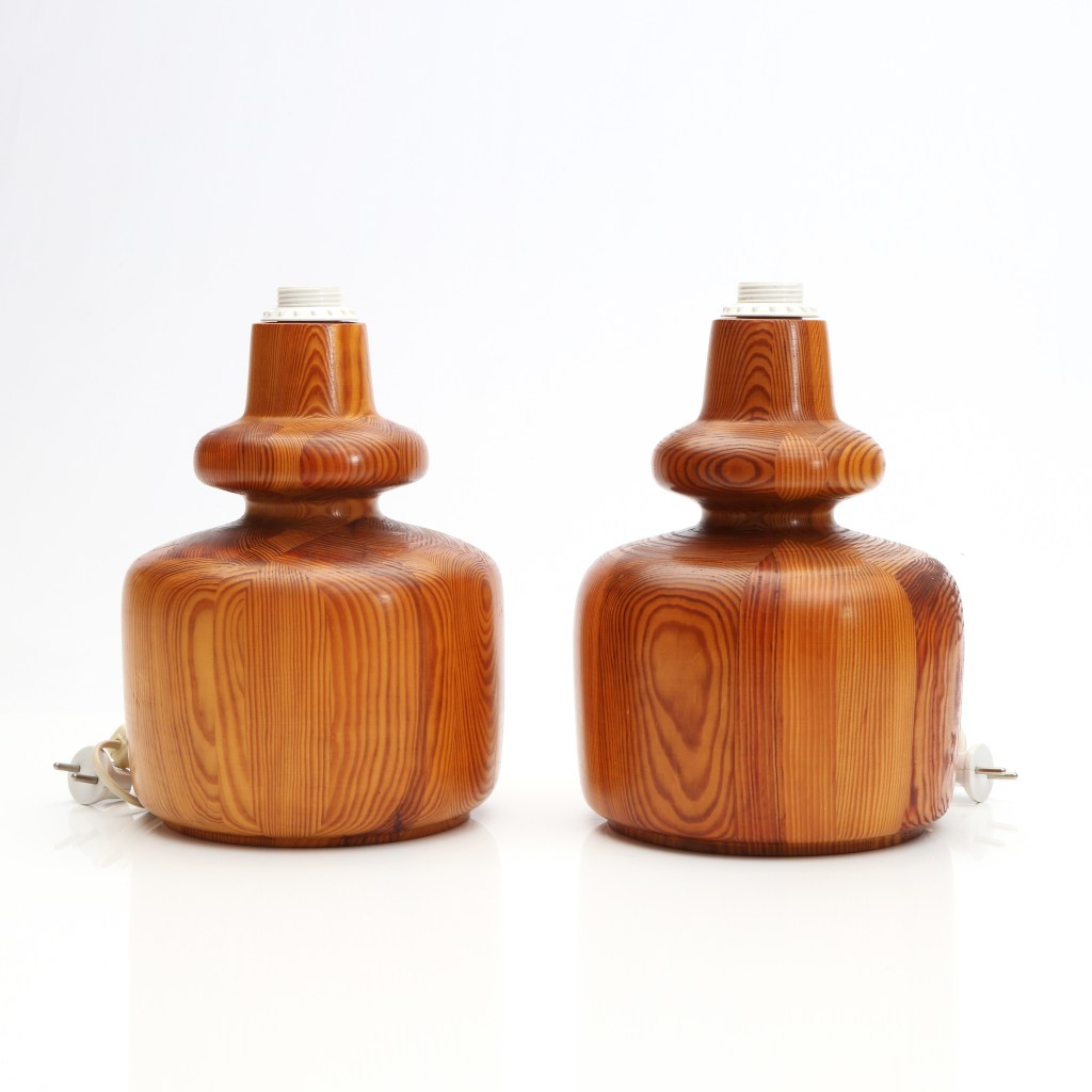 17. Lampfötter. Ett par bordslampor i furu, från Rinkaby Konsthantverk, av Henning Skov. Utrop 1 000 kronor, sålda för 6 000 kronor hos Skånes auktionsverk.