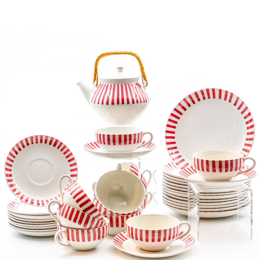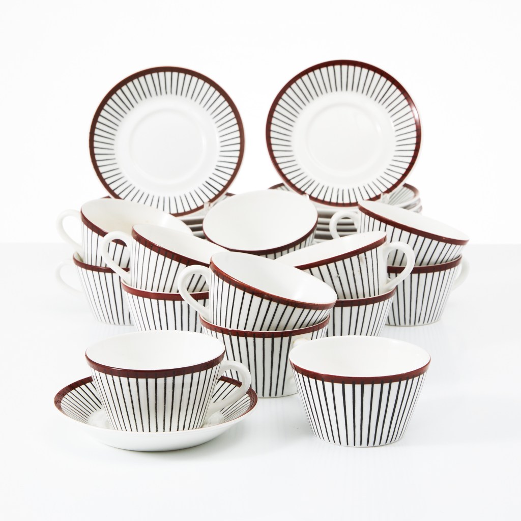 2. . Spisa Ribb. En älskad servis av Stig Lindberg. Han tog fram den till H55 utställningen i Helsingborg. Var i produktion mellan 1955 och 1974, nästan 20 år. Här 51 delar. Utrop 4 000 kronor, klubbad för 6 100 kronor hos Stockholm auktionsverk.