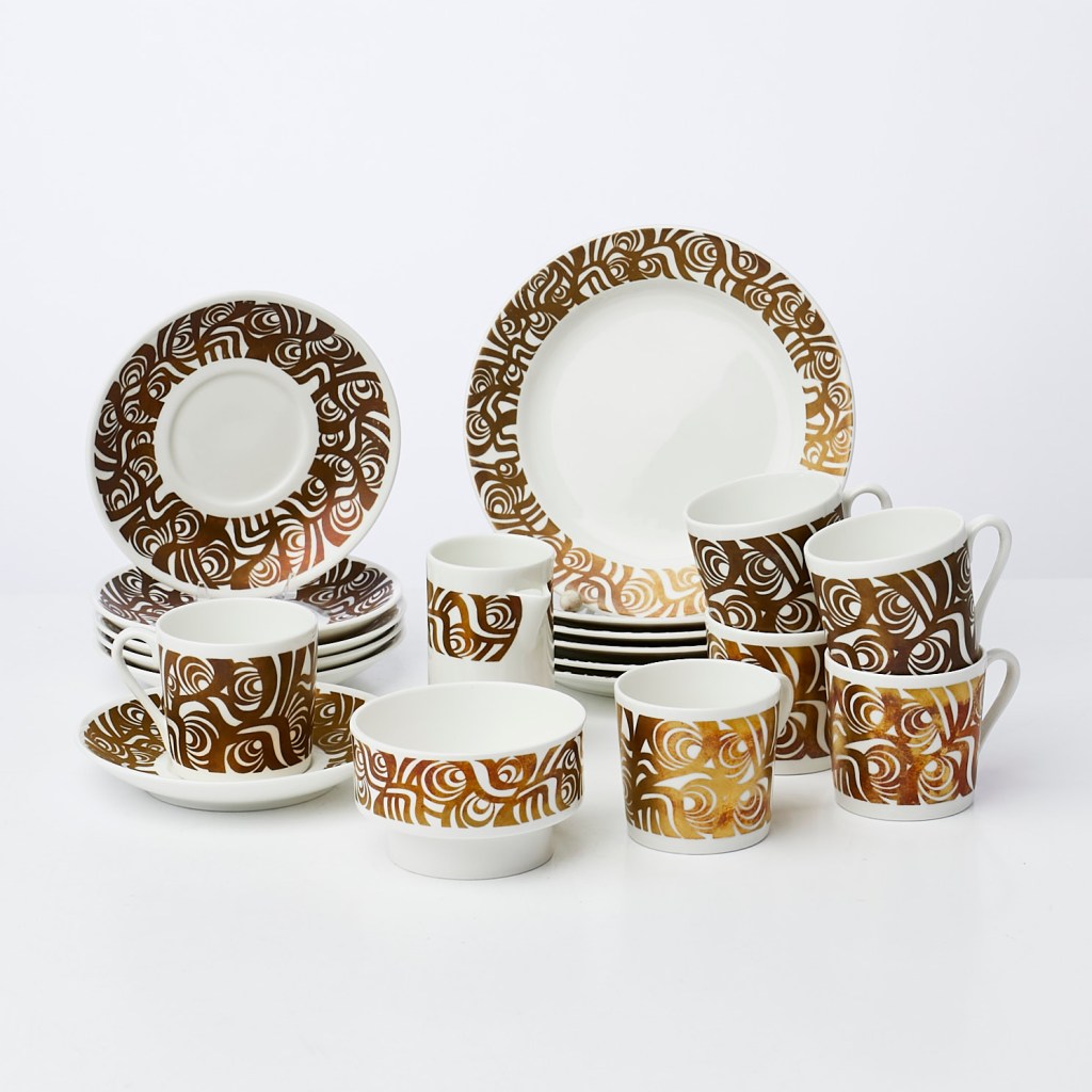 8. Aramis. Mönster av Margareta Hennix, tillverkades mellan 1968 och 1971. 26 delar hade ett utrop på 1 000 kronor, klubbades för 1 076 kronor hos Stockholms auktionsverk.