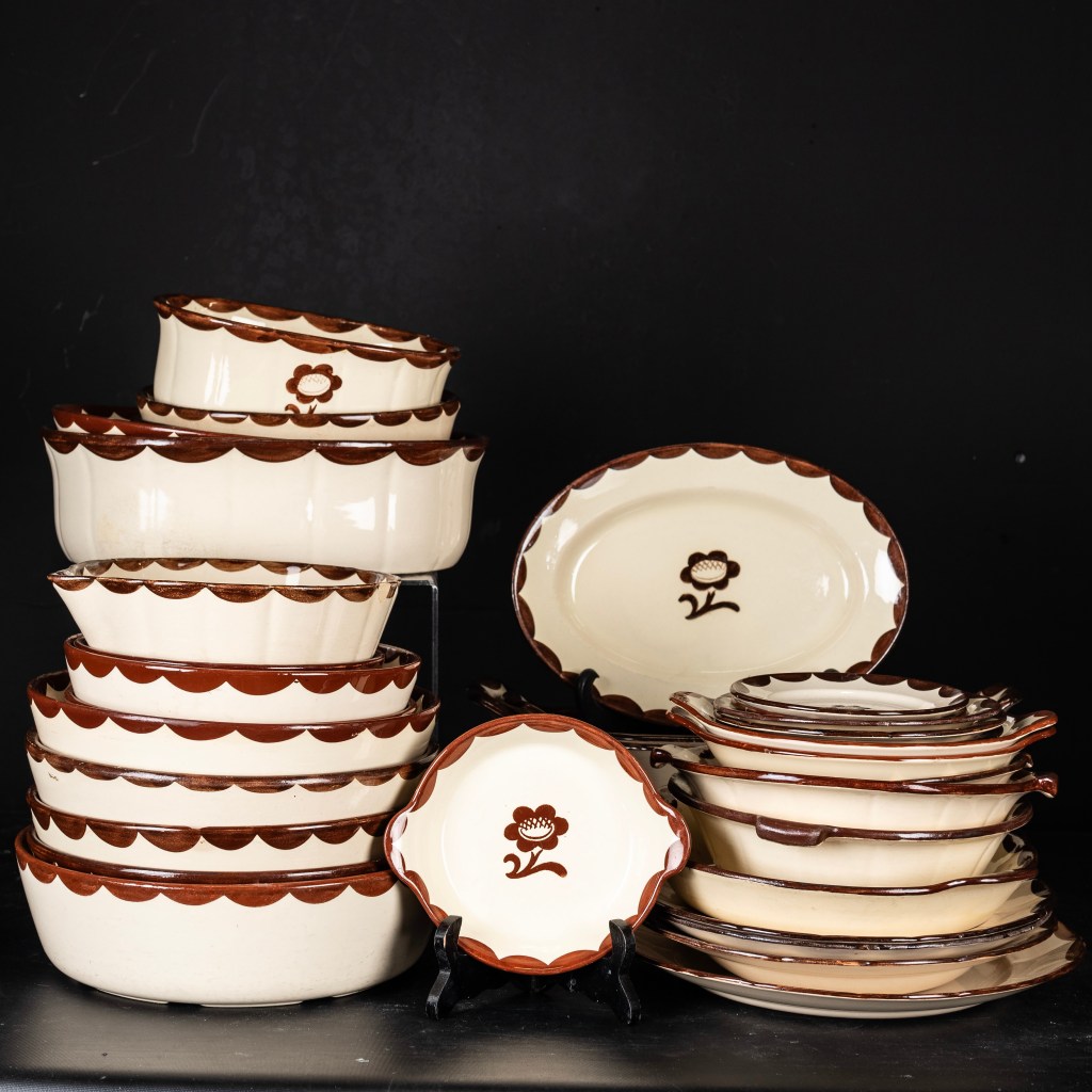 - Pyro. Wilhelm Kåges servis Liljeblå blev aldrig den stora arbetareservis som det var tänkt. Det blev däremot Pyro. Den var en stor hit och fanns i produktion från 1930 fram till 1955. Det var dessutom den första ugnsfasta servisen. Tillverkades först i brunt, men även i grönt från 1934 och i blått från 1940. Har varit mycket eftertraktad på andrahandsmarknaden men nu har intresset svalnat något. 70 delar, utrop 8 000 kronor, såld för 7 521 kronor hos Handelslagrets auktionsservice.