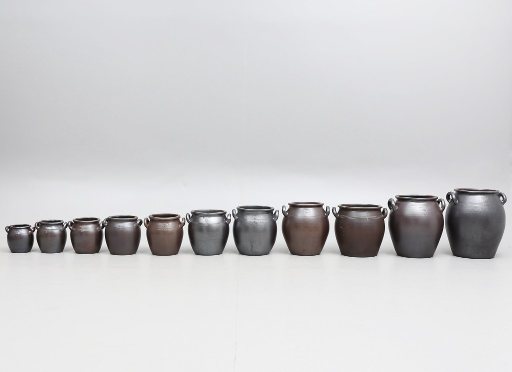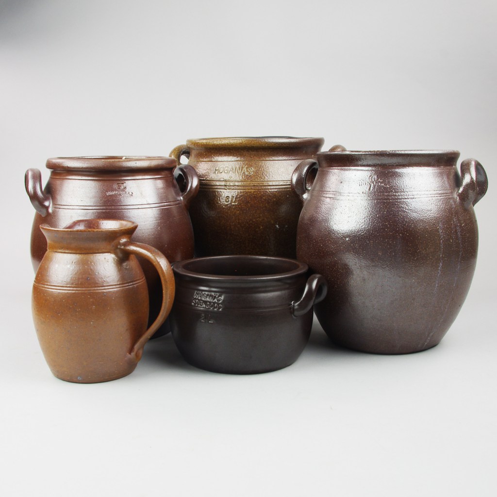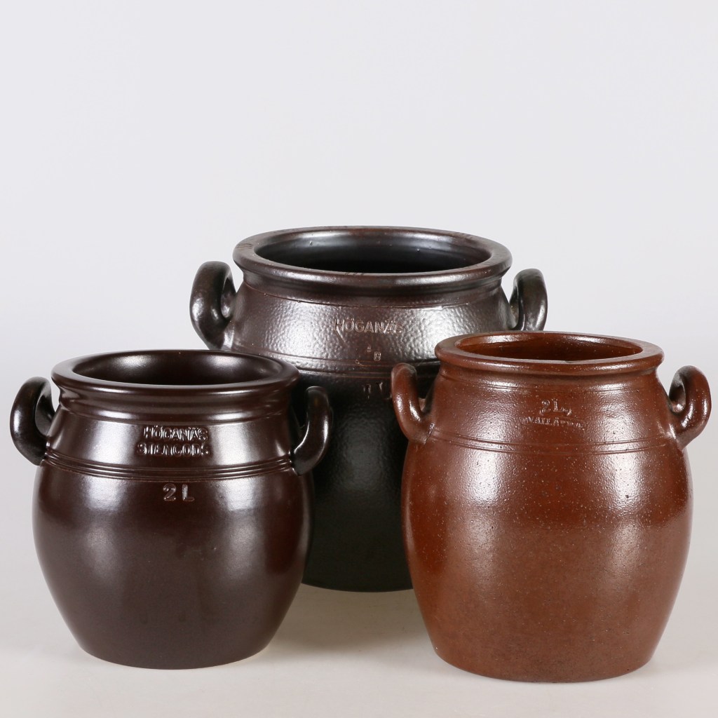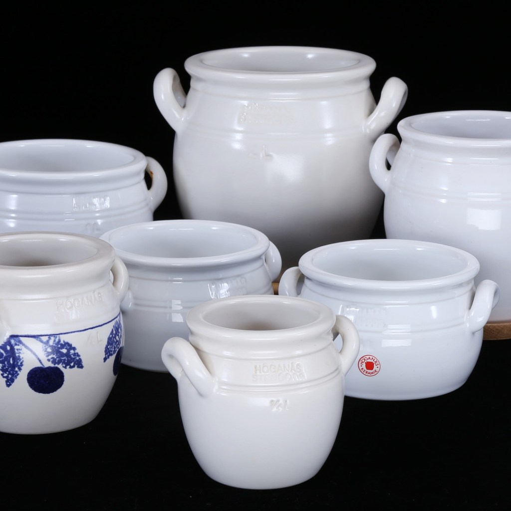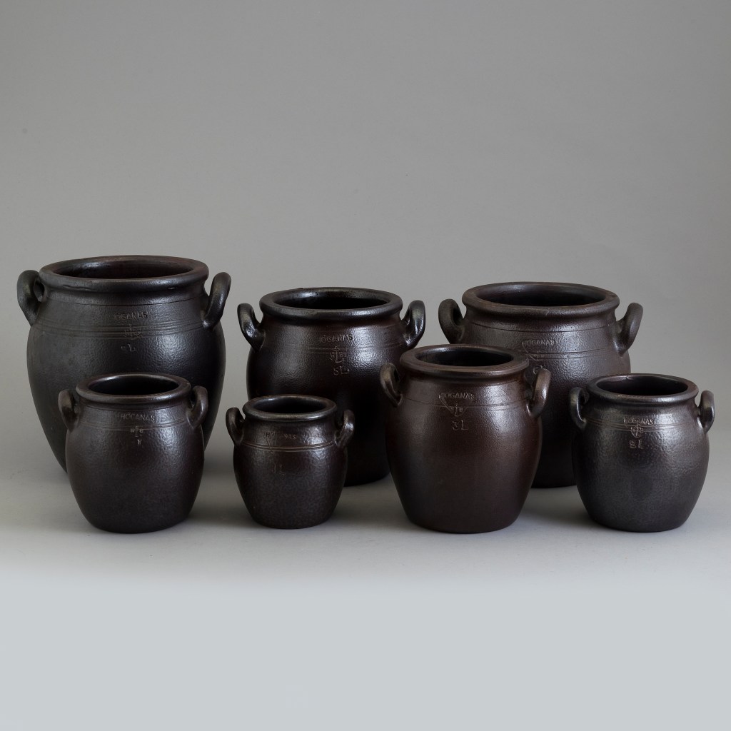 2. Krus från Höganäsbolaget. Sju saltglaserade krus i olika storlekar, från åtta liter ner till en liter. Krusen är från första hälften av 1900-talet. Volymen anges i liter, det är märkt med L på krukan under stämpeln med det typiska ankaret. Är en kruka tillverkad före 1890 har den volymen angiven med K som står för kannor. Utrop 2 000 kr hos bukowskis.online.