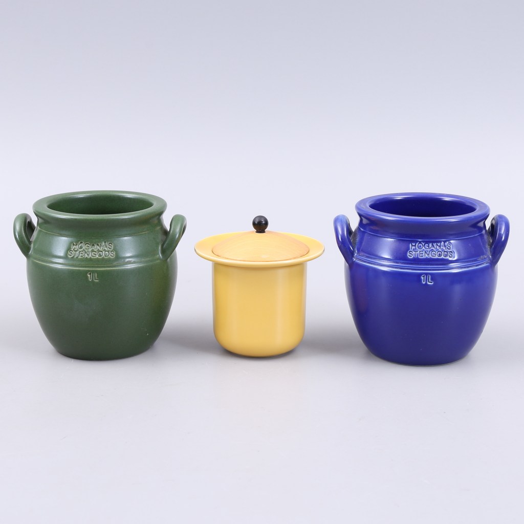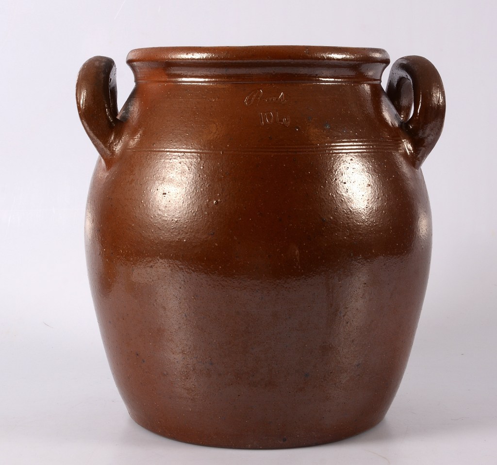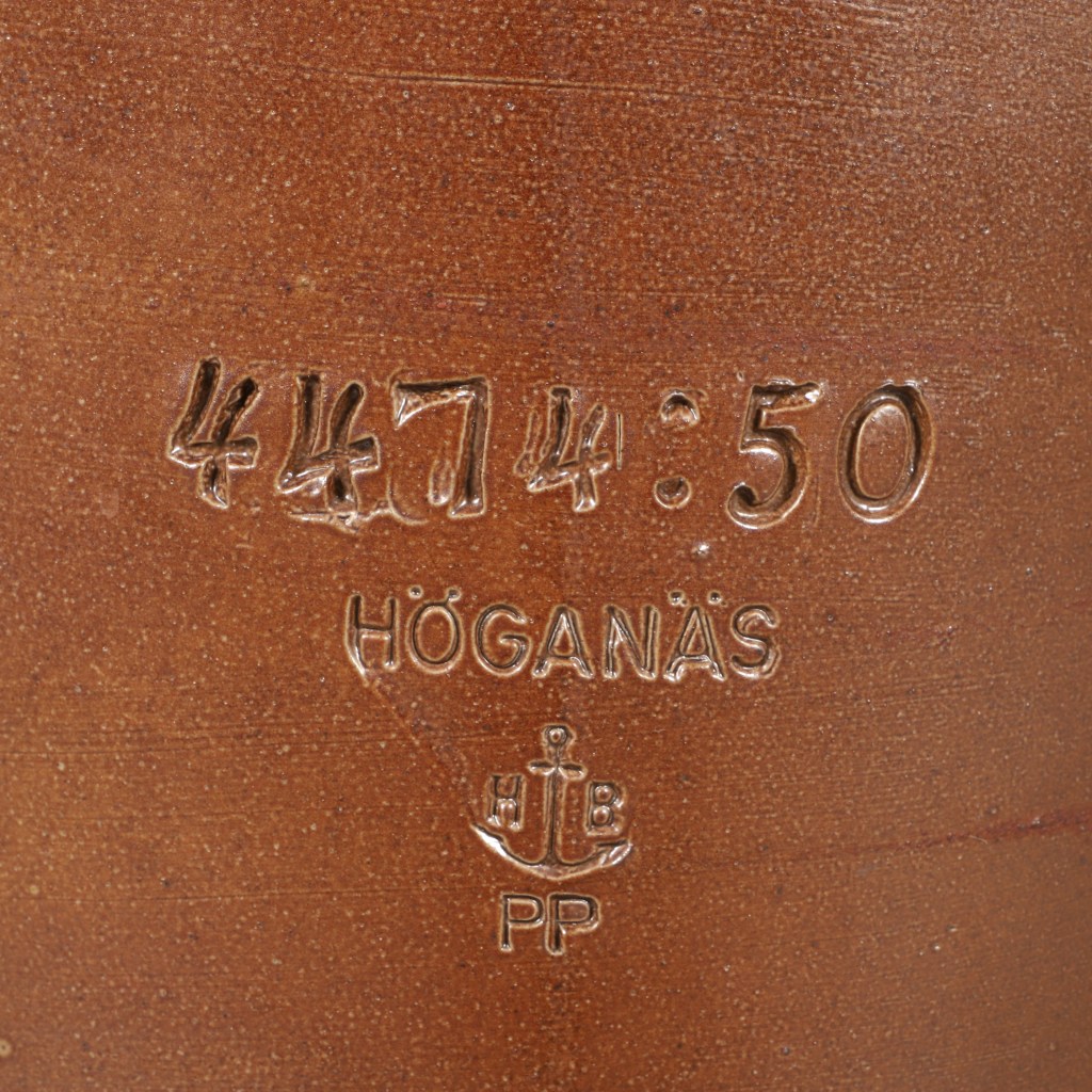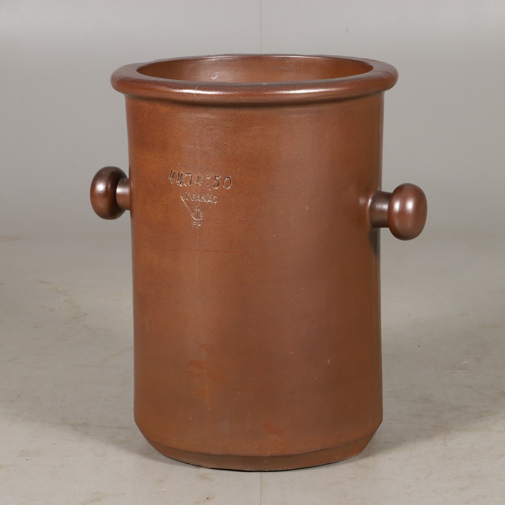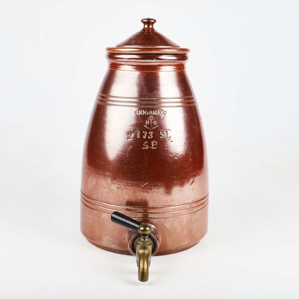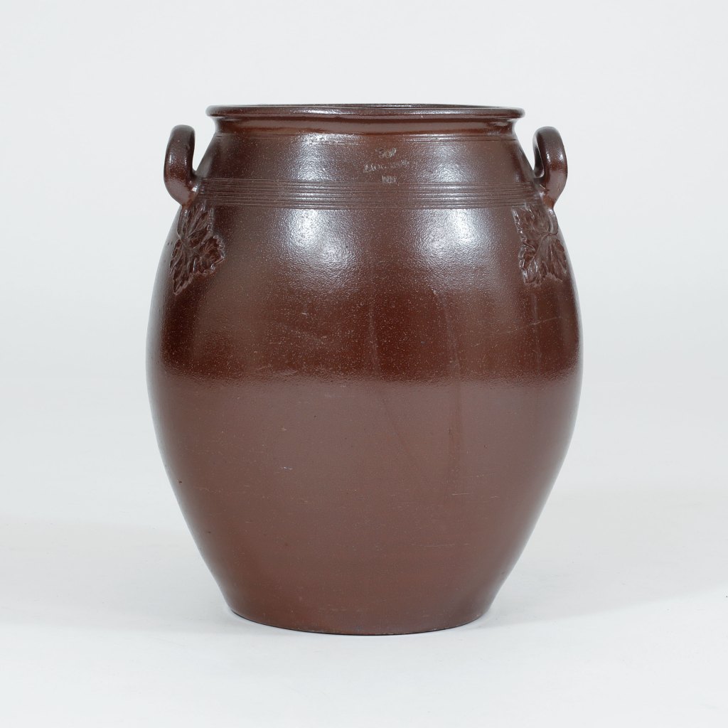 12. Kruka med öron . Den här typen av kruka påminner om de vattenfilterapparater som Höganäsbolaget tillverkade i början av 1900-talet. Öronen mitt på är typiska. Detta krus som rymmer 50 liter är förmodligen tillverkat mellan 1915 och 1926 då stämpeln med ankaret hade en mjukare böj nedtill. Dessa krukor brukar gå för mycket mer än syltburkarna. Utrop 800 kr, men såld för hela 3 600 kr hos Helsingborgs auktionskammare.