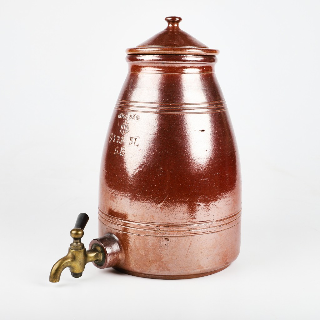 13. Tappkran. En 5 liters tappkran, från Höganäsbolaget. Signaturen SB står för drejaren Sven Bohlin, verksam mellan 1936 fram till 1986. Utrop 400 kr, klubbad för 350 kr i höstas hos Helsingborgs auktionskammare.