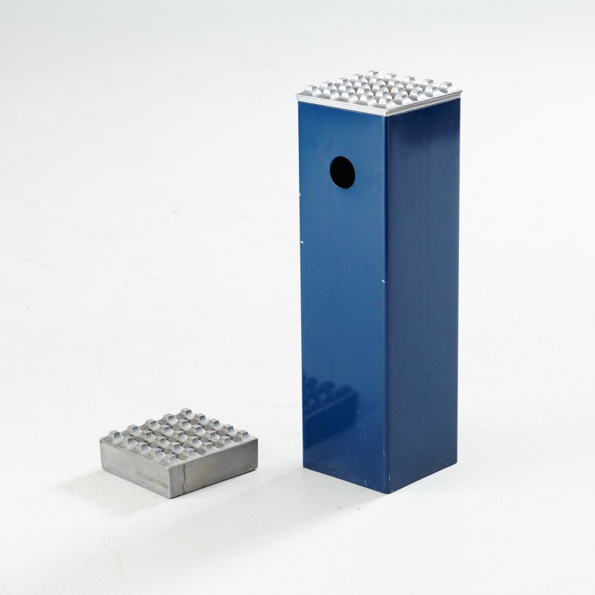 Föregående bild Nästa bild Ultima GOLVASKOPP, ASKKOPP, Beck & Ljung, ”Ultima 15”, underrede i form av blå plast, askkopparna i formgjuten aluminium, golvaskkoppens mått höjd 50, 15×15 cm. Utrop 1 500 kr, klubbat pris 400 kr. Stockholms auktionsverk i april 2014.