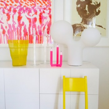 Mixa nytt och retro! Litografier av Peter Dahl och Olle Nyman, inköpa på auktion, för några hundralappar. Skänk, Koivisto, rea-fynd. Vas, Mezzo av Ann Wåhlström/KostaBoda, auktionsfynd för 400 kr. Ljusstakar Celeste, Anne Nilsson/Orrefors, gåva men finns på auktion. Ljusstake PS kollektion 2017, Ikea, 129 kr. DoubleBubble lampa av Eero Aarnio,