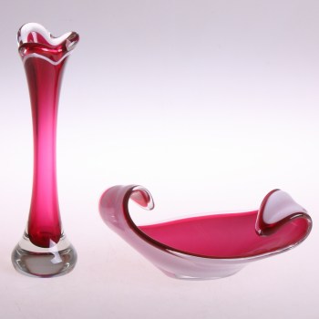 Föregående bild Nästa bild hd_item_707073_e85f67c26f Coquille, skål och vas, Paul Kedelv, signerade, Flygfors glasbruk, daterad -58 samt -56. Utrop 600 kr. auctionet.com