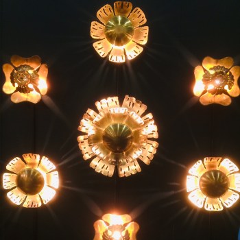 Vackraste vägglamporna. Om dessa vägglampor i mässing har jag tipsat flera gånger i Aftonbladet genom åren. Nu hängde denna ljuvliga vägg i montern hos retroaffären Nova. Fyra stycken är formgivna av norrmannen Svend Aage Holm-Sörensen, med de övriga tre är från forma Lars Holmström i Arvika. Vägglampor är riktiga bubblare! Släng inte.